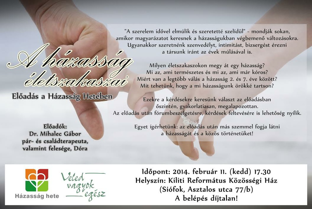 Február 11-én kedden 17.30-kor a kiliti gyülekezeti házba várnak bennünket szeretettel. Dr. Mihalec Gábor és Dóra a házasság életszakaszairól ad elő nekünk.