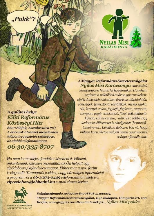 Tisztelettel kérjük, hogy az ciposdobozokat gyülekezetenként összegyűjtve juttassák el Kilitire. További részletekkel örömmel szolgál Bozsoki-Sólyom János kiliti lelkipásztor.