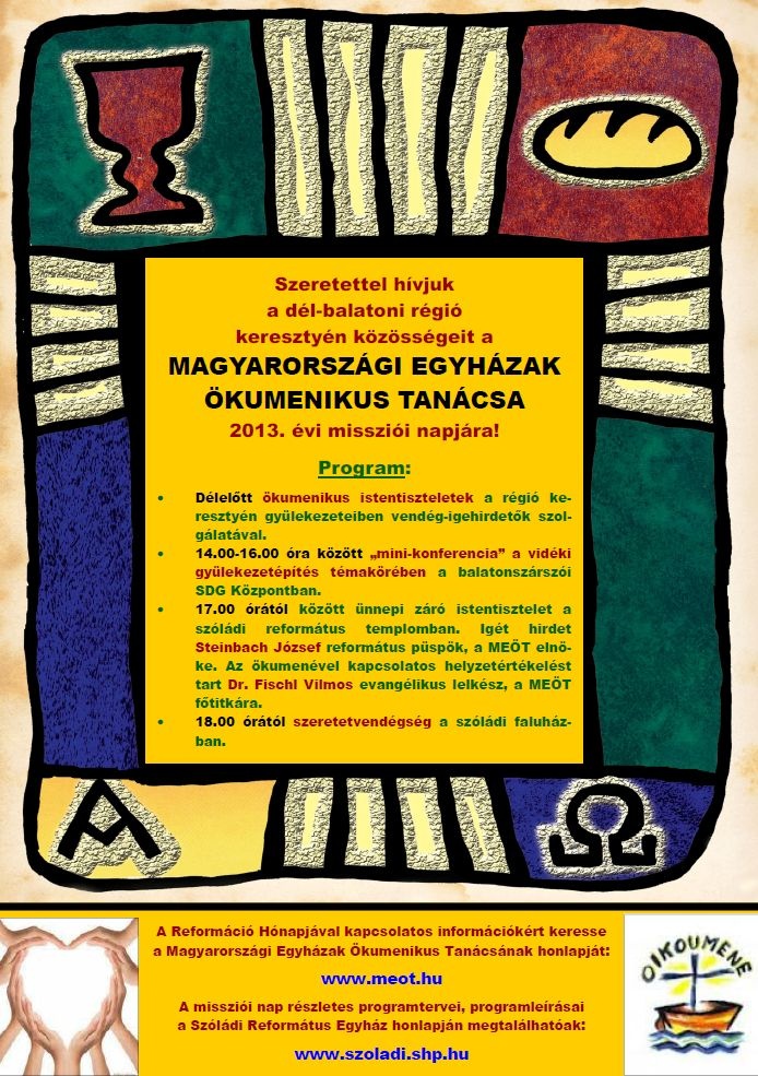 Október 13-án tartotta a Magyarországi Egyházak Ökumenikus Tanácsa a Missziói és Evangelizációs Bizottság szervezésében évről évre megrendezésre kerülő Ökumenikus Missziói Napját, idén a dél-balatoni régióban. Az idei évben a missziói nap témája a vidéki gyülekezetépítés volt.