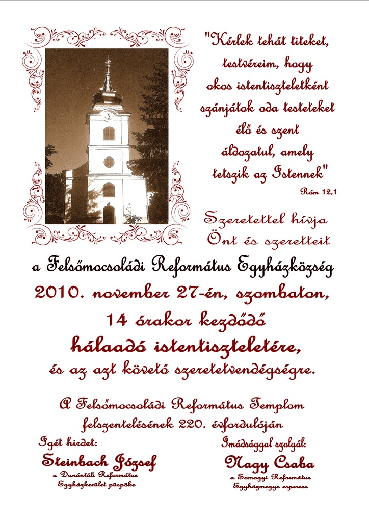 Szeretettel hívja Önt és szeretteit a Felsőmocsoládi Református Egyházközség hálaadó Istentiszteletére a Felsőmocsoládi Református Templom felszentelésének 220. évfordulóján,